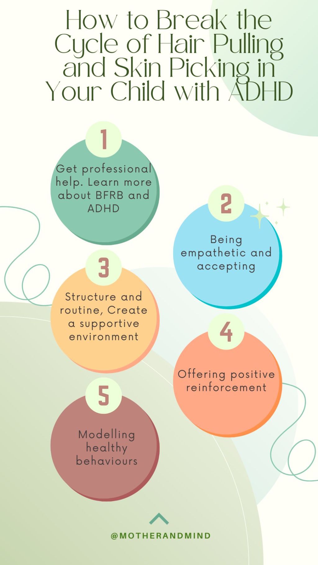 - Learn more about BFRB and ADHD: The second thing you should do is educate yourself and your child about these conditions and how they affect them. You can read books, articles, websites, or blogs that provide reliable and accurate information about BFRB and ADHD. You can also join online or offline support groups or forums to connect with other parents or individuals with similar experiences. You can also teach your child about their condition and help them recognise their strengths and challenges. You can remind them that they are not responsible for their habits and are not alone in their difficulties.