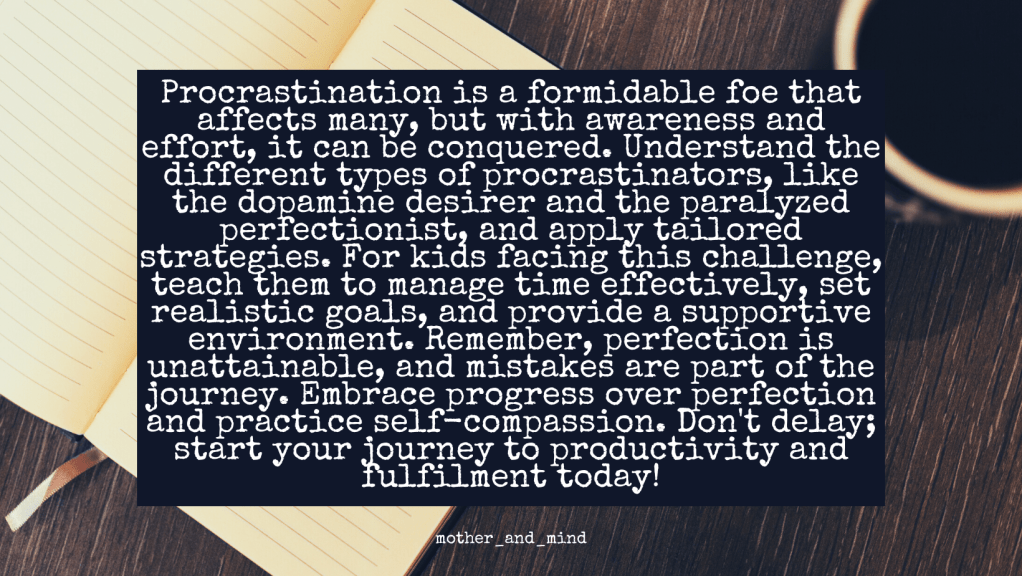 With awareness and effort, you can change your habit of procrastination. By understanding different types of procrastinators and applying the appropriate strategies, individuals can overcome this challenge and improve productivity. Additionally, helping kids manage their time effectively lays a foundation for their success and well-being in the future. Don’t delay; start implementing these strategies now and experience the benefits of improved productivity and reduced stress. Good luck!