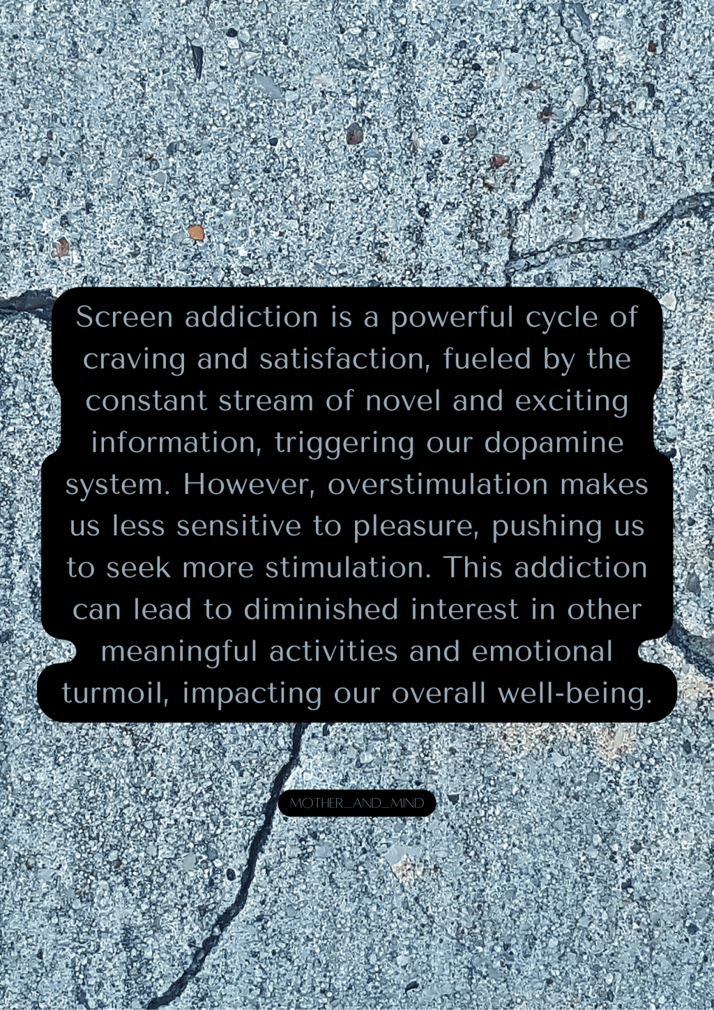 The addictive power of screens lies in their ability to stimulate dopamine release in our brains. Dopamine is a chemical messenger that makes us feel good, motivated, and rewarded. While it’s naturally involved in essential activities like eating and sleeping, artificial stimuli like digital media can also trigger its release. We receive a constant stream of novel and exciting information when we use screens, activating our dopamine system. This creates a cycle of craving and satisfaction, which keeps us hooked. Unfortunately, overstimulation of this system can lead to decreased sensitivity, resulting in the need for more stimulation to experience the same level of pleasure.