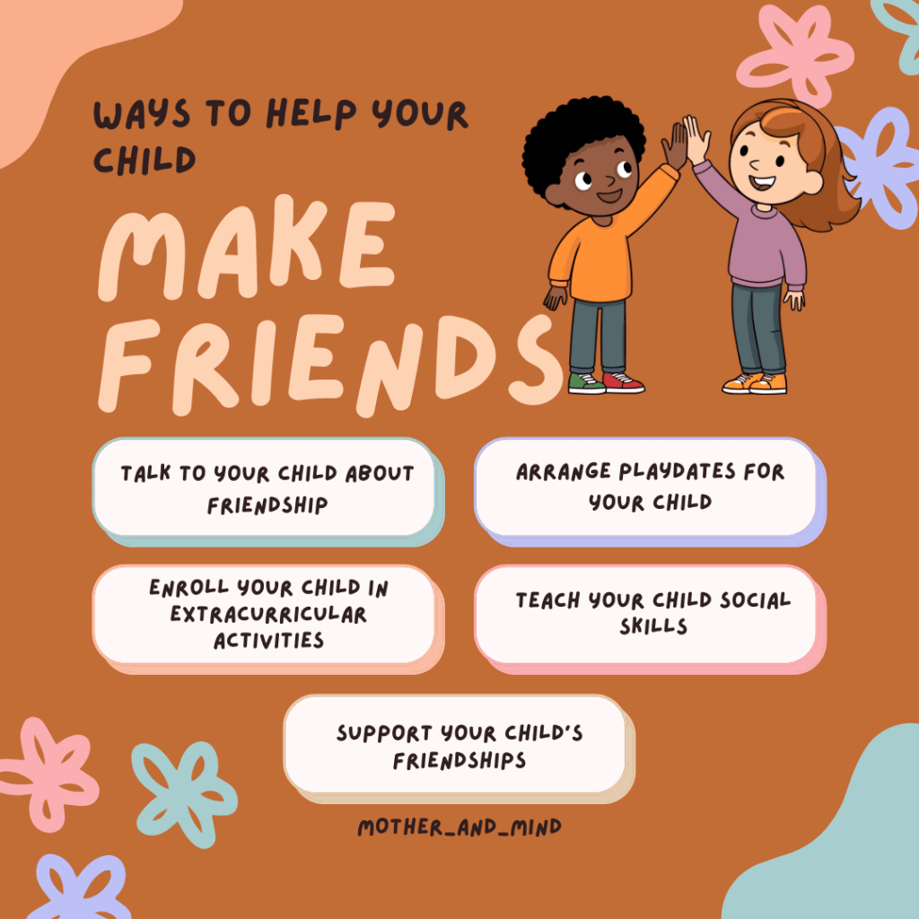 Friendship is a valuable gift that can enrich your child’s life in many ways. As a parent, you can help your child make friends by talking to them about friendship, arranging playdates, enrolling them in extracurricular activities, teaching them social skills, and supporting their friendships. Doing so can help your child develop socially and emotionally and enjoy the happiness of friendship.