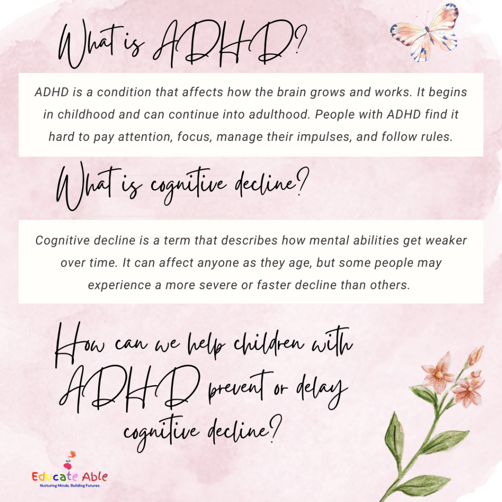 Preventing or delaying cognitive decline in children with ADHD is challenging, but early diagnosis and intervention are crucial. Timely treatment, which may include medication, behavioural therapy, and psychoeducation, can significantly improve a child’s symptoms and overall quality of life. It can also help prevent other problems that can worsen cognitive function as people age.