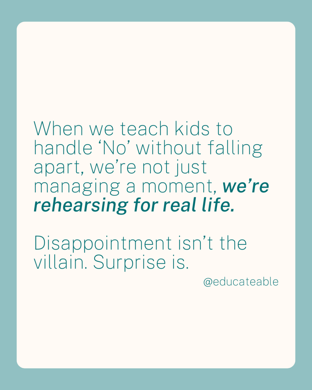 Learning to cope with “No” is a life skill. It sets kids up for moments where friends cancel plans, projects get rejected, or life simply says “Not today.”